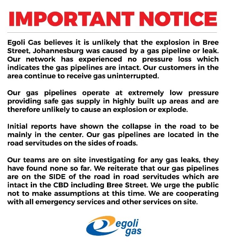 However, Egoli Gas company said it was unlikely that the explosion was caused by a pipeline or leak.