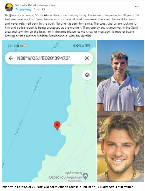 Kefalonia – A 20-year-old tourist from South Africa, identified only as “Benjamin”, was found dead on Friday in the waters off Kefalonia, Greece, reports greekcitytimes.com.