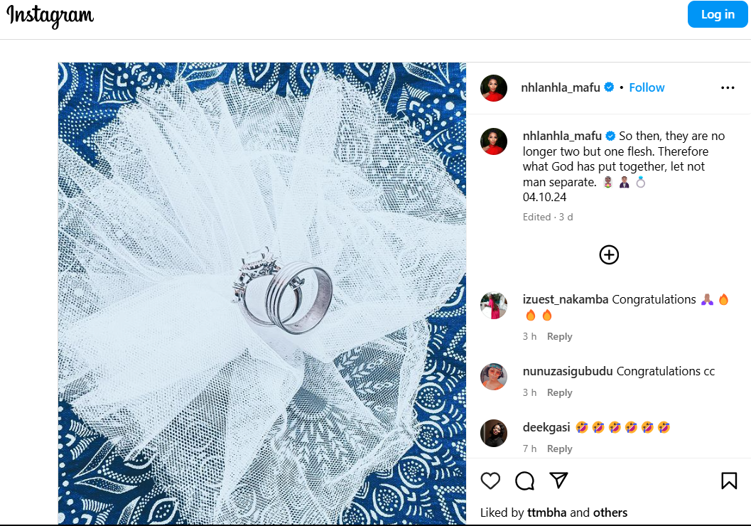 Nhlanhla added fuel to the rumours with her Instagram post that said: “So then, they are no longer two but one flesh. Therefore what God has put together, let not man separate.”