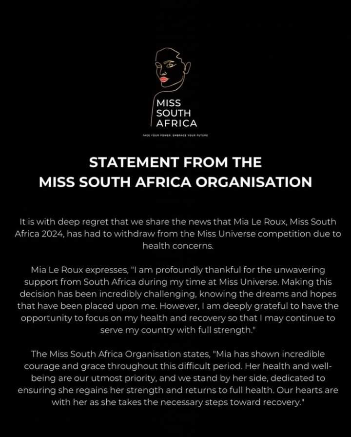 A statement from the Miss South Africa organisation posted on X said: “It is with deep regret that we share the news that Mia Le Roux, Miss South Africa 2024, has had to withdraw from the Miss Universe competition due to health concerns”.