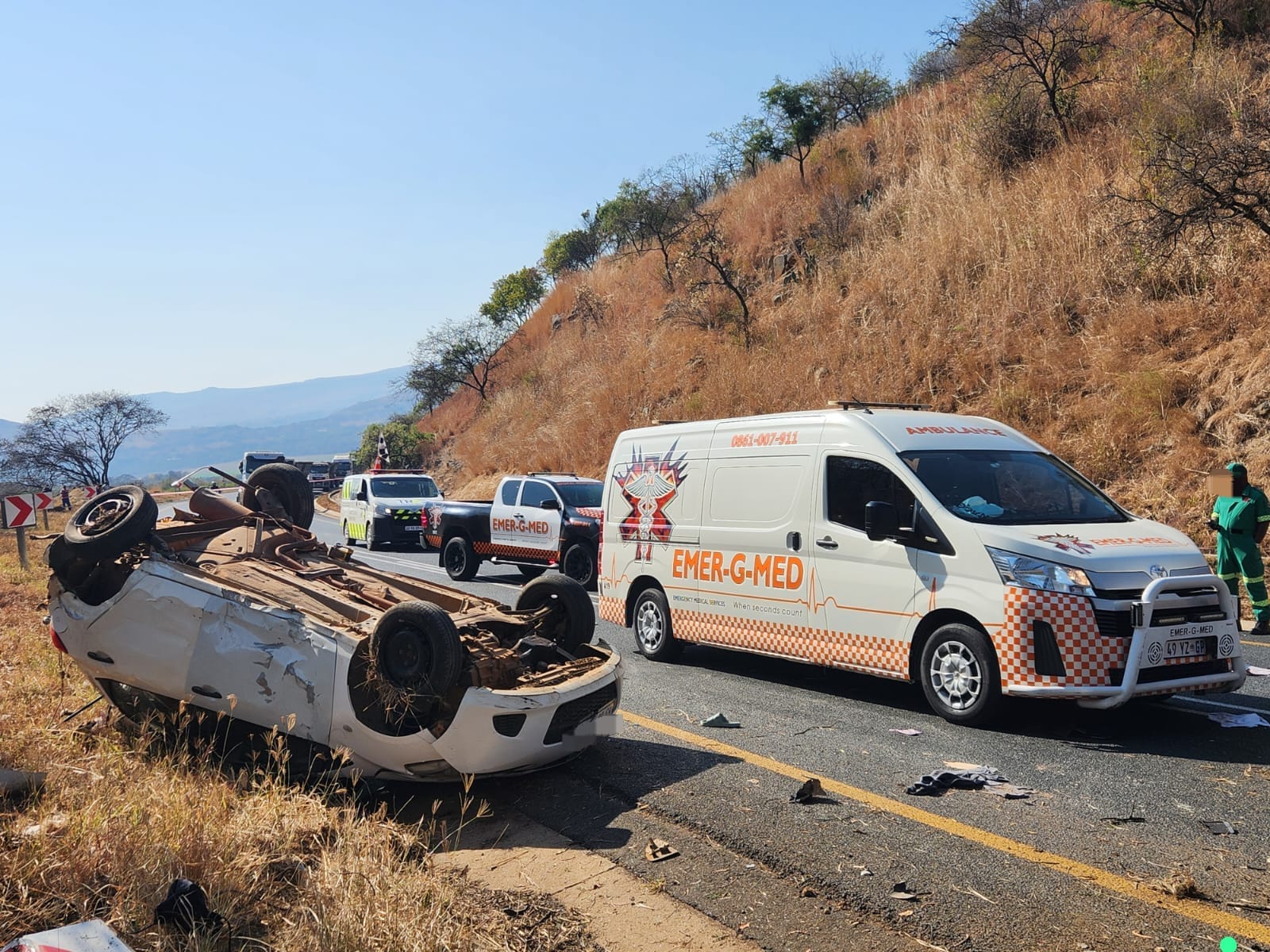 “On arrival on the scene, a single light motor vehicle was found to have overturned several times before coming to a rest on its roof,” said Kyle van Reenen of Emer-G-Med.